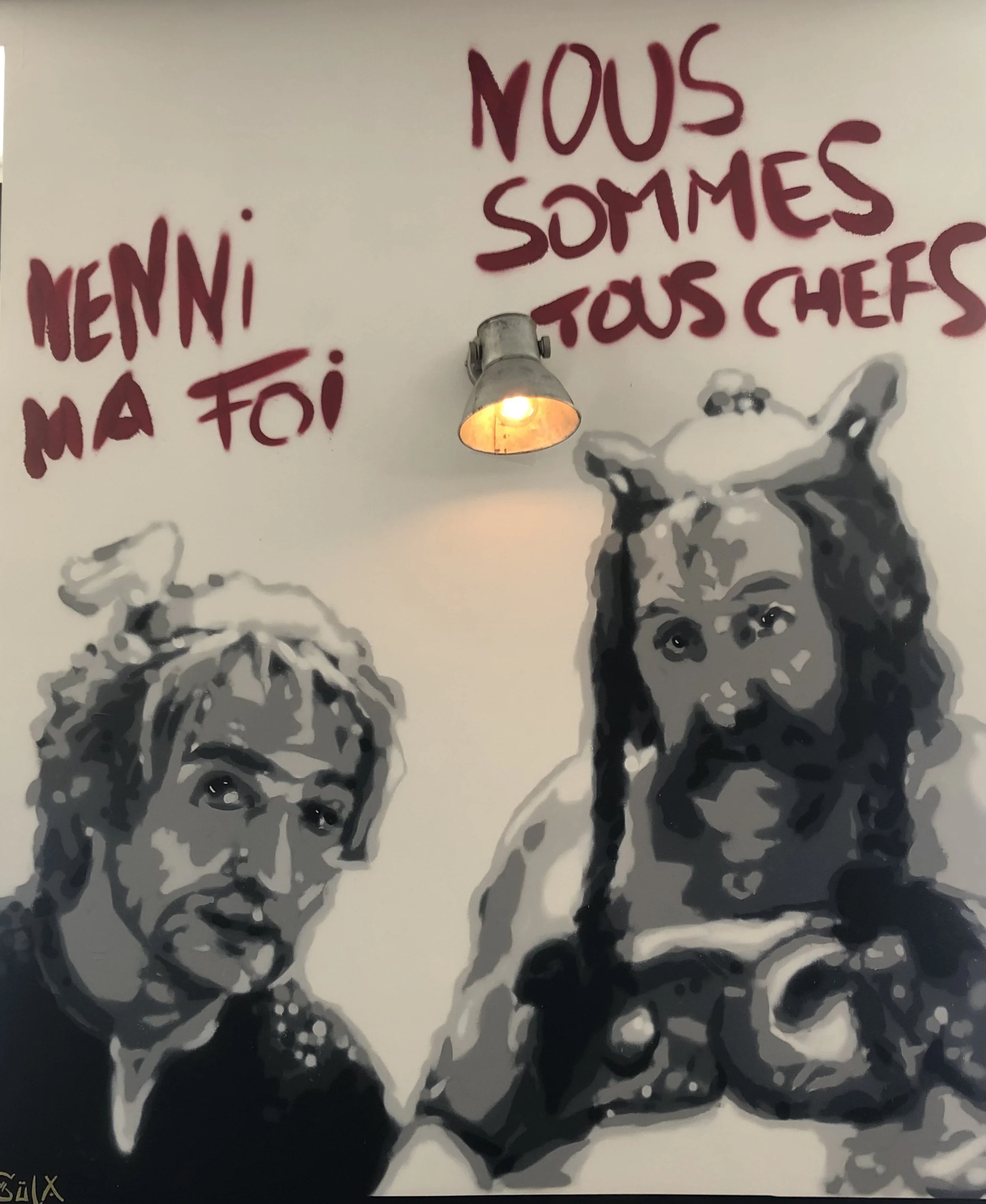 Ce cri de résistance et de solidarité m’a immédiatement évoqué l’univers d’Astérix et Obélix, ces irréductibles Gaulois qui, avec humour et bravoure, défendent inlassablement leur village contre l’envahisseur. J’ai donc choisi de représenter les acteurs emblématiques d’un des films de la saga, en clin d’œil à cet esprit de révolte et de camaraderie indéfectible.