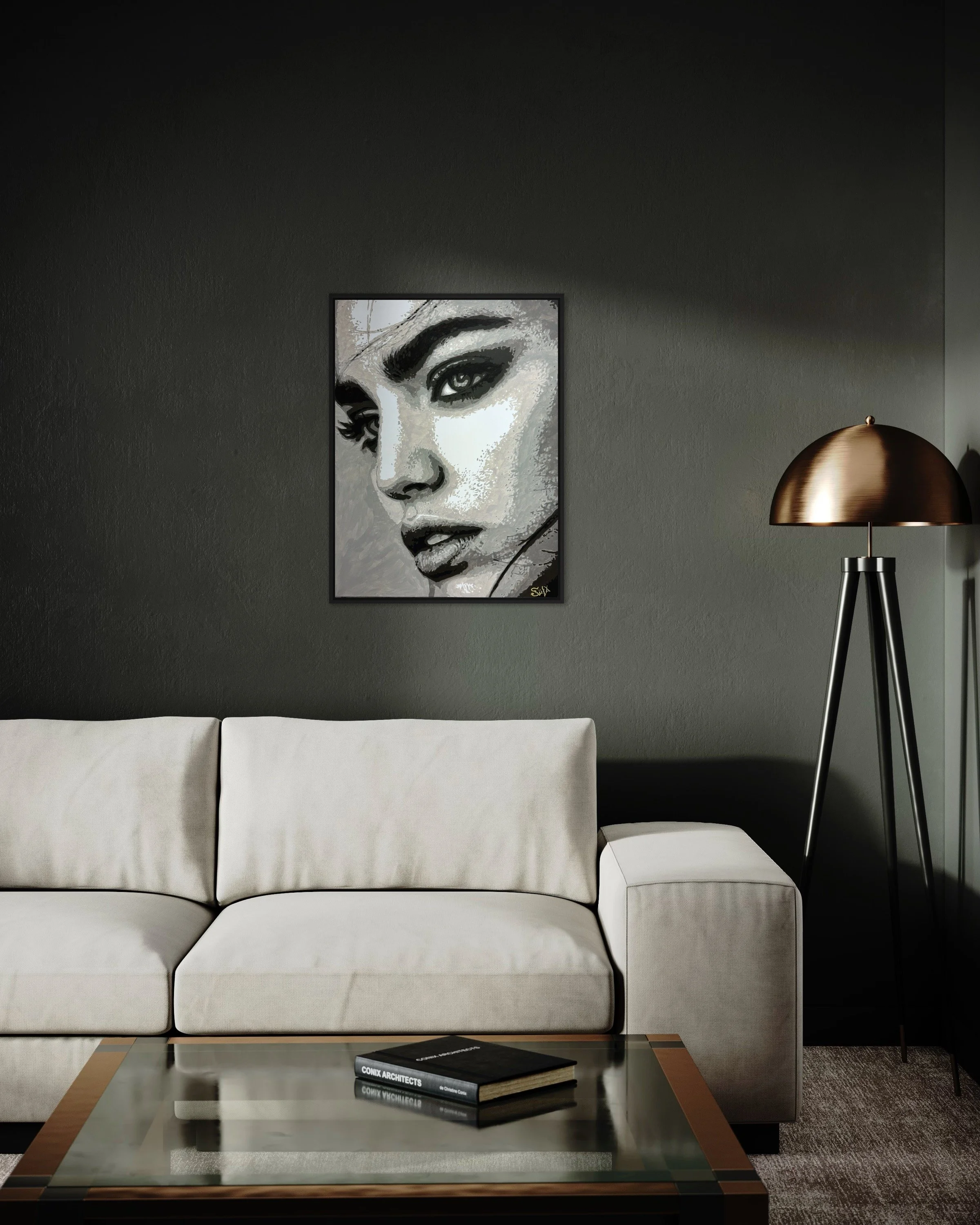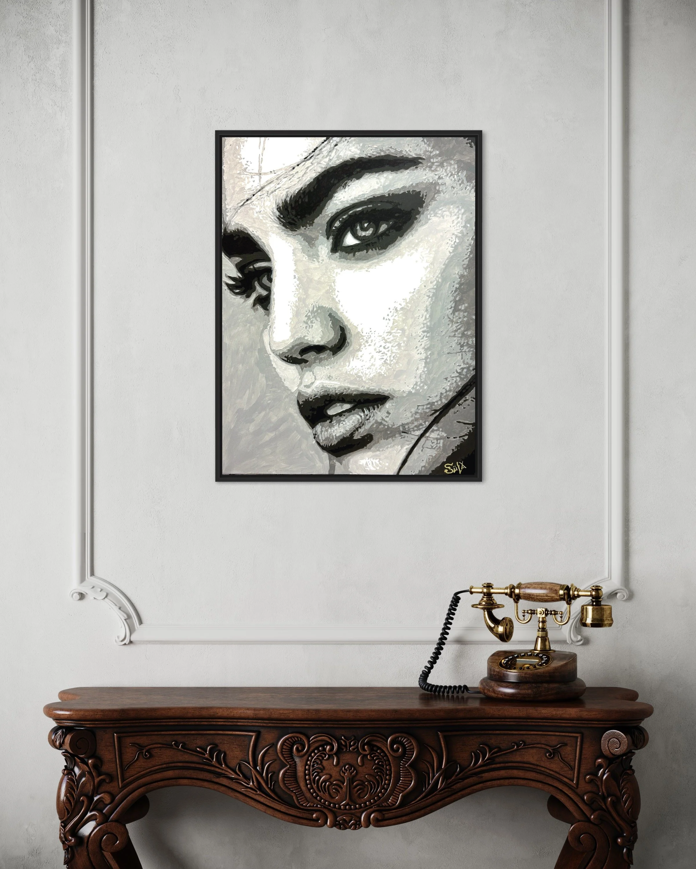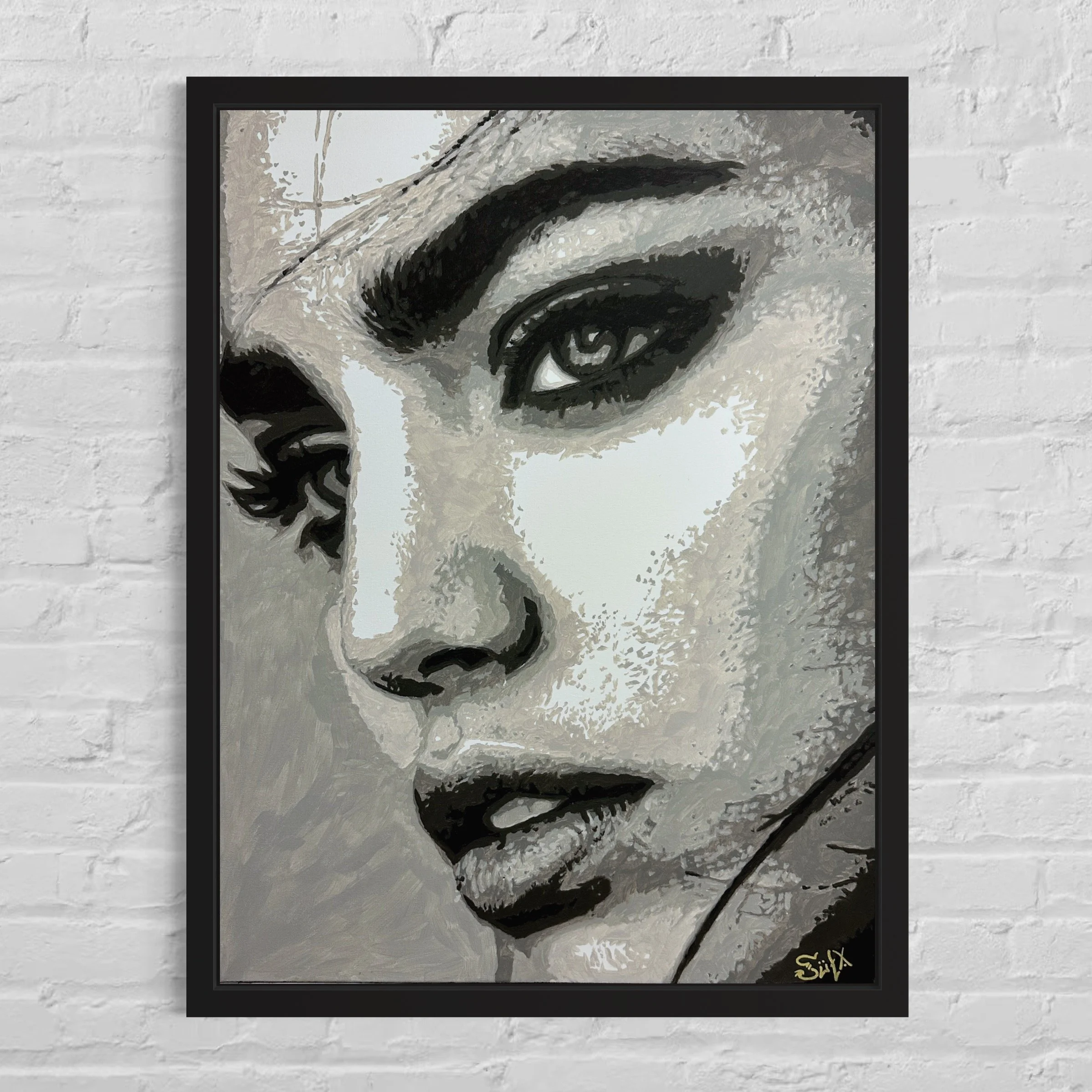Le choix du monochrome n’est pas anodin : il amplifie la force émotionnelle et laisse toute la place à l’intensité du regard. Chaque nuance de gris, chaque texture est pensée pour révéler la lumière invisible qui anime ce portrait. Cette œuvre fait partie de ma quête artistique : traduire ce qui ne peut être vu, mais qui peut être ressenti – cette énergie vibratoire qui nous compose et nous relie.