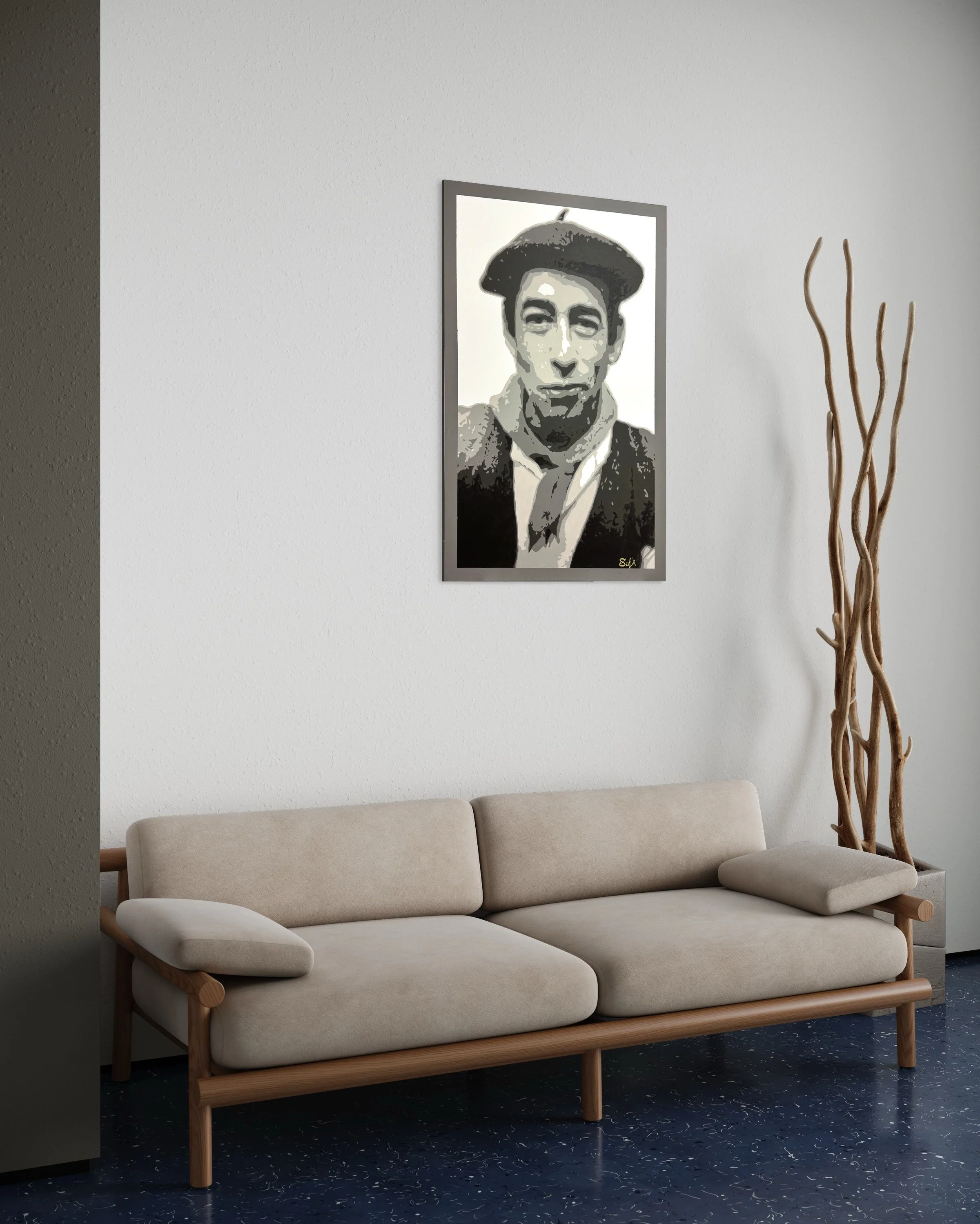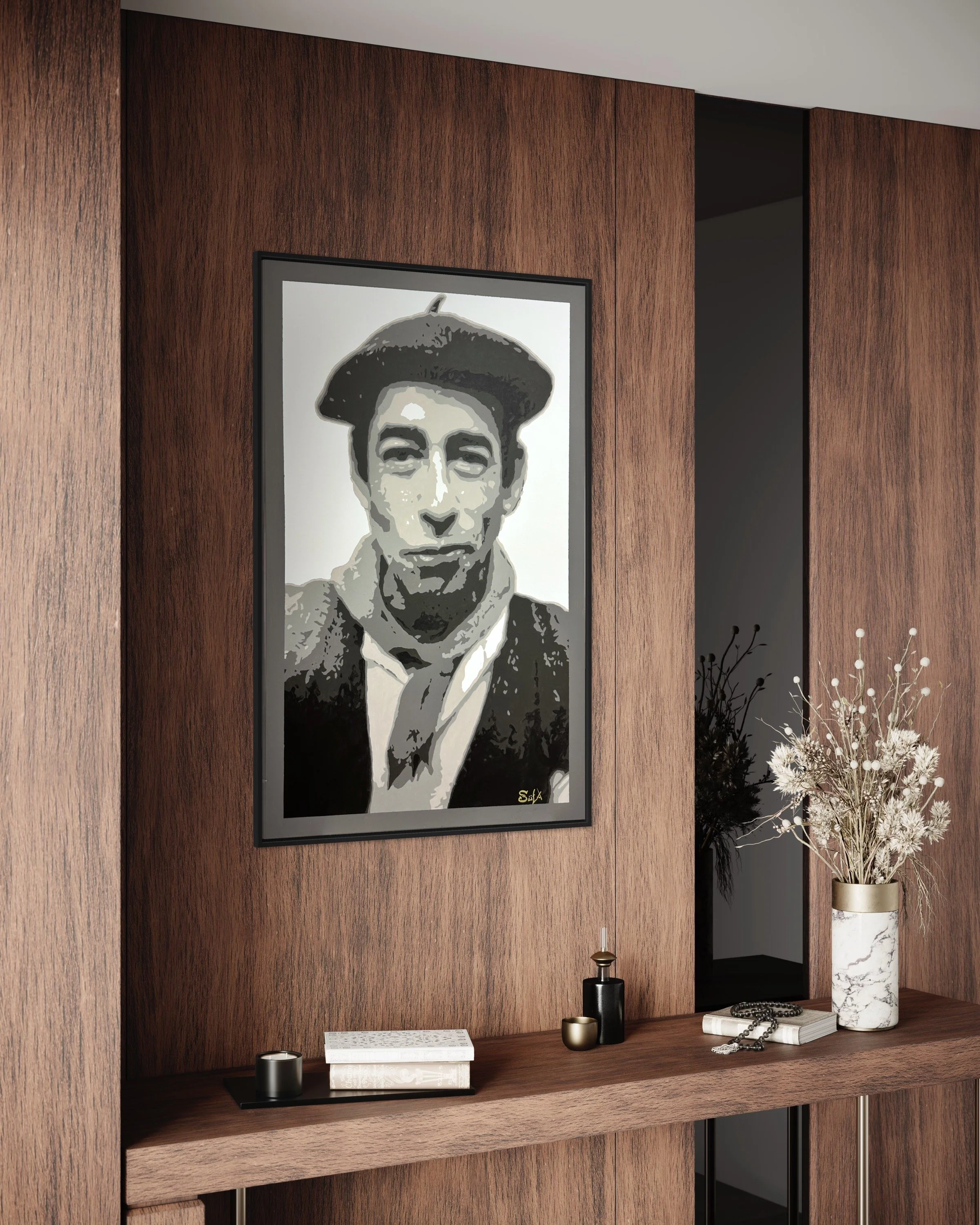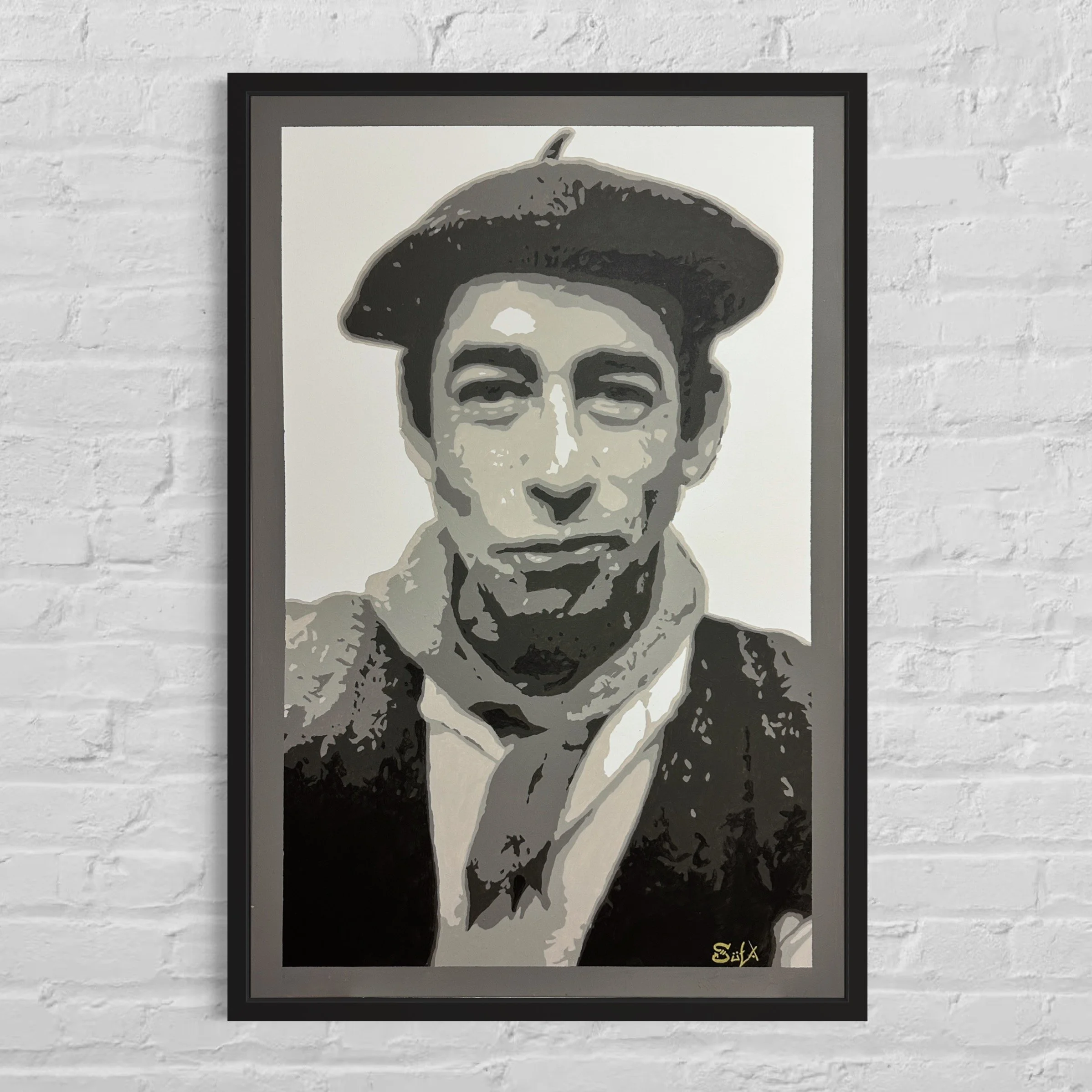 J’ai voulu rendre hommage à sa personnalité chaleureuse et à son amour pour les savoir-faire oubliés, notamment la création artisanale de sabots. Le choix des tons monochromes souligne le caractère intemporel de son image et l’écho de son influence dans la vie du village.