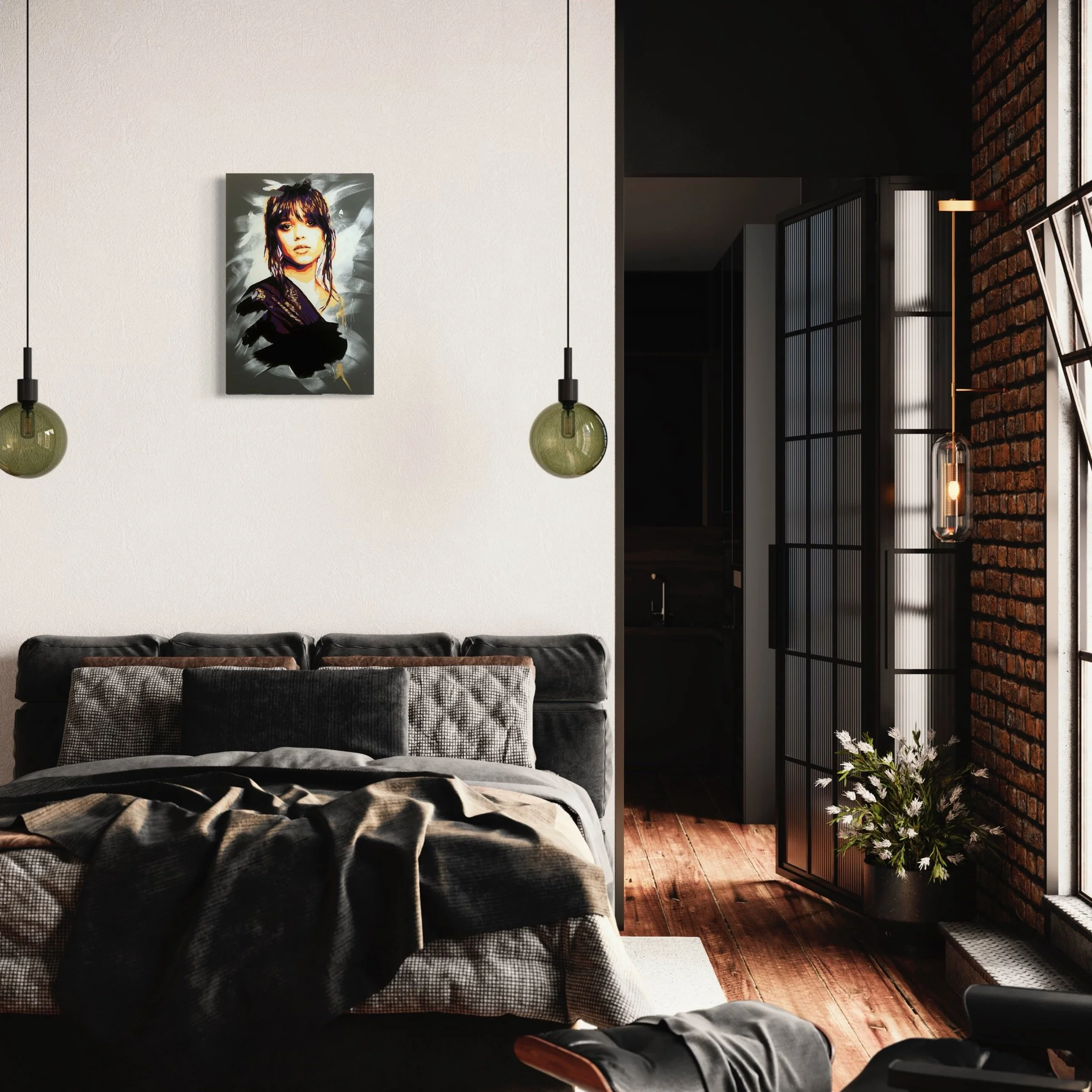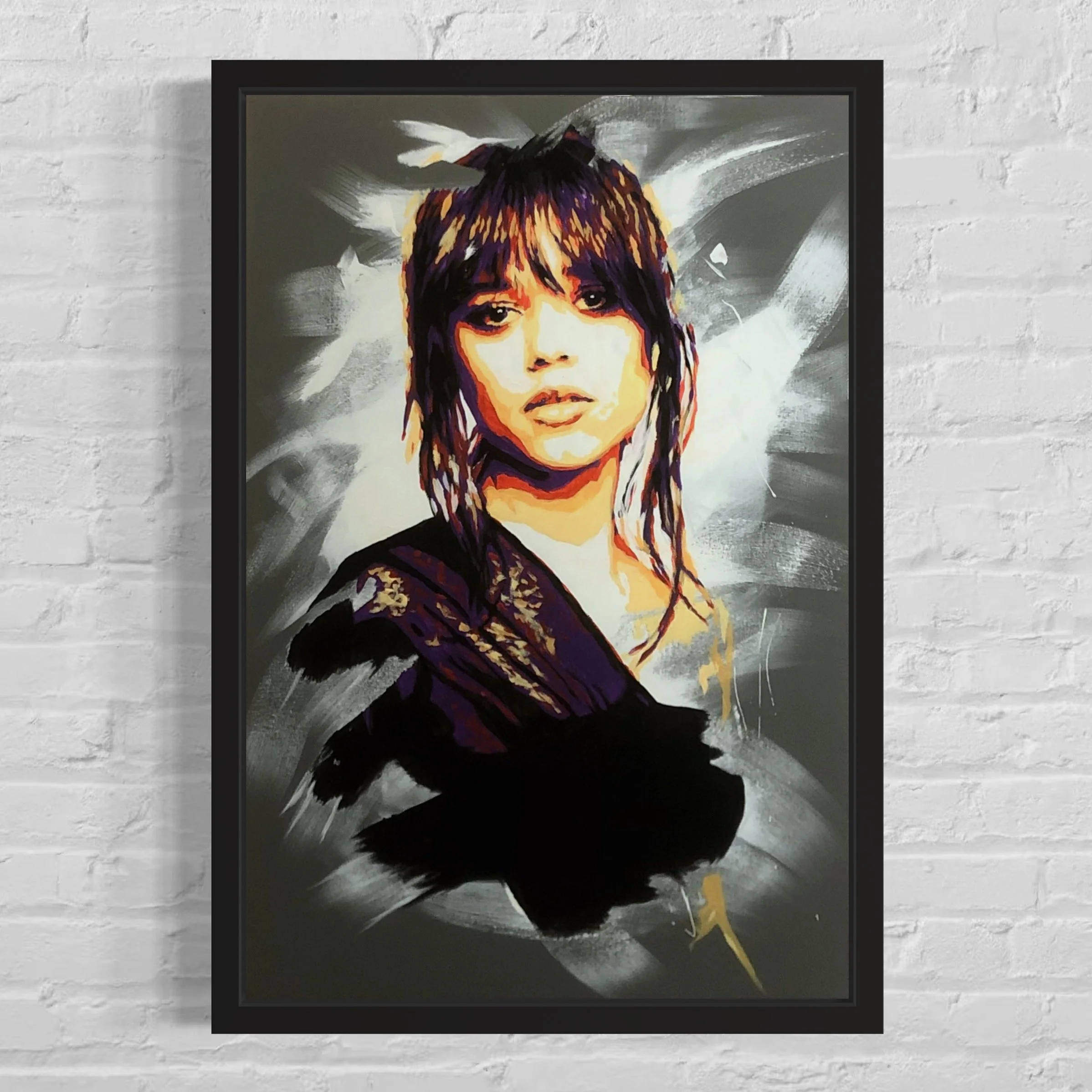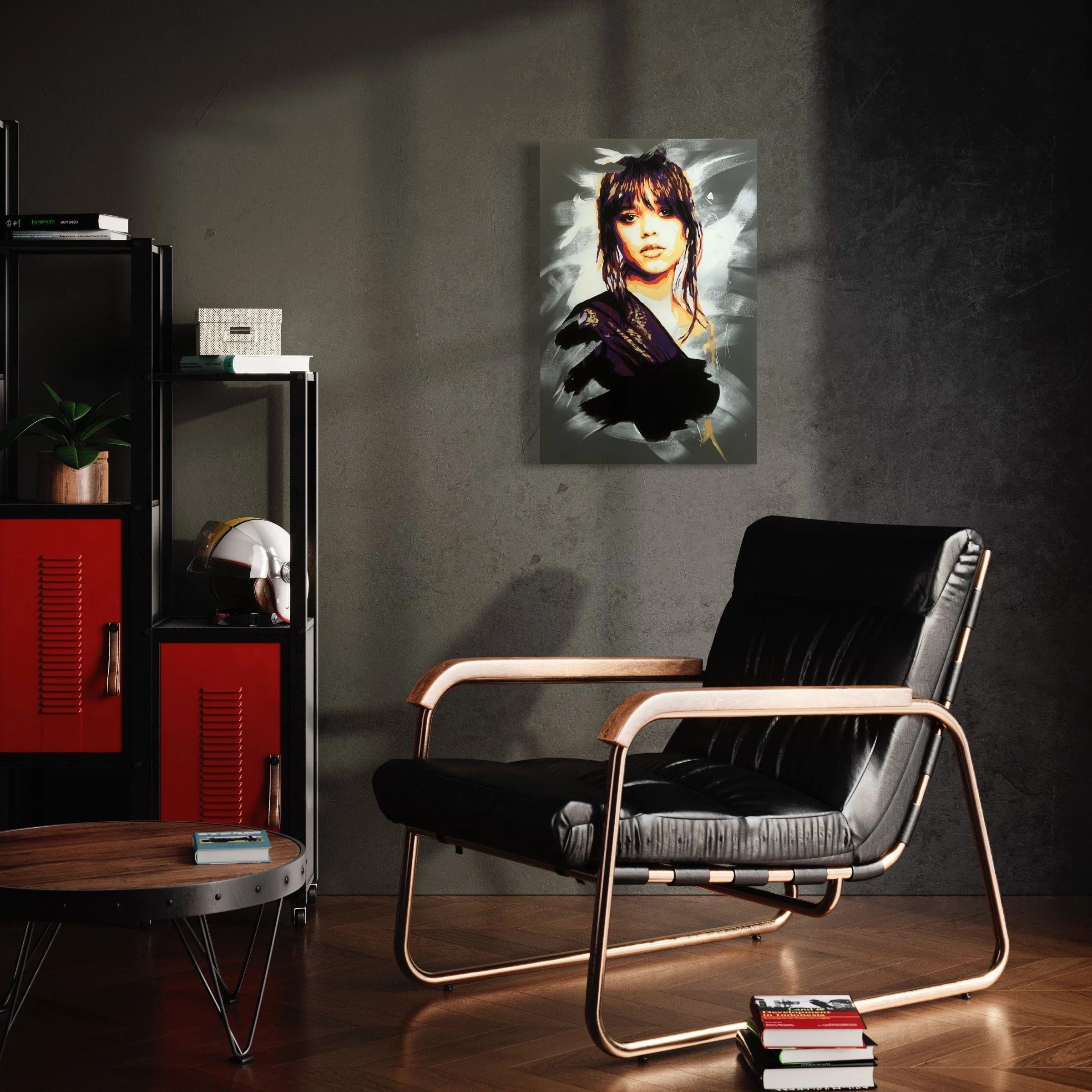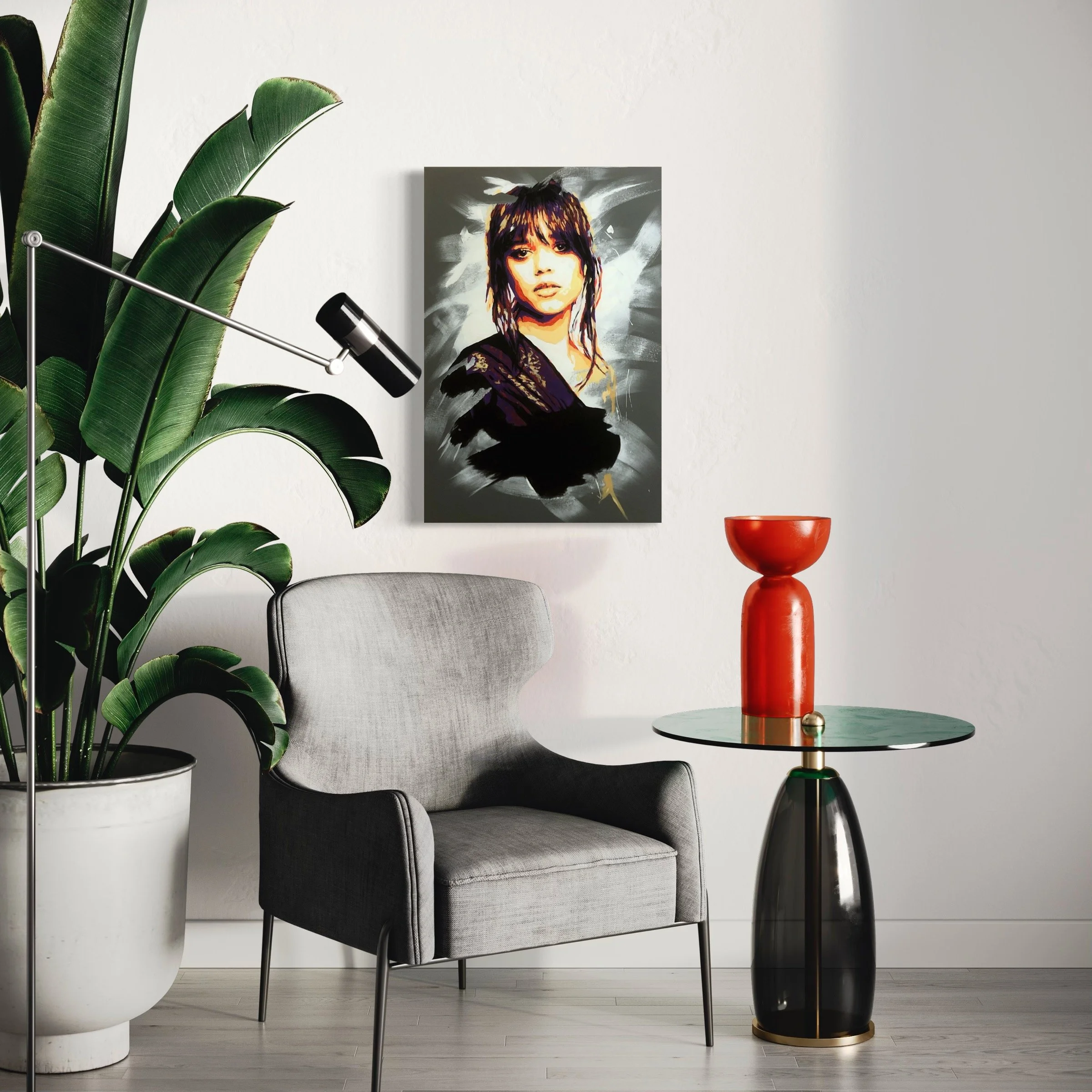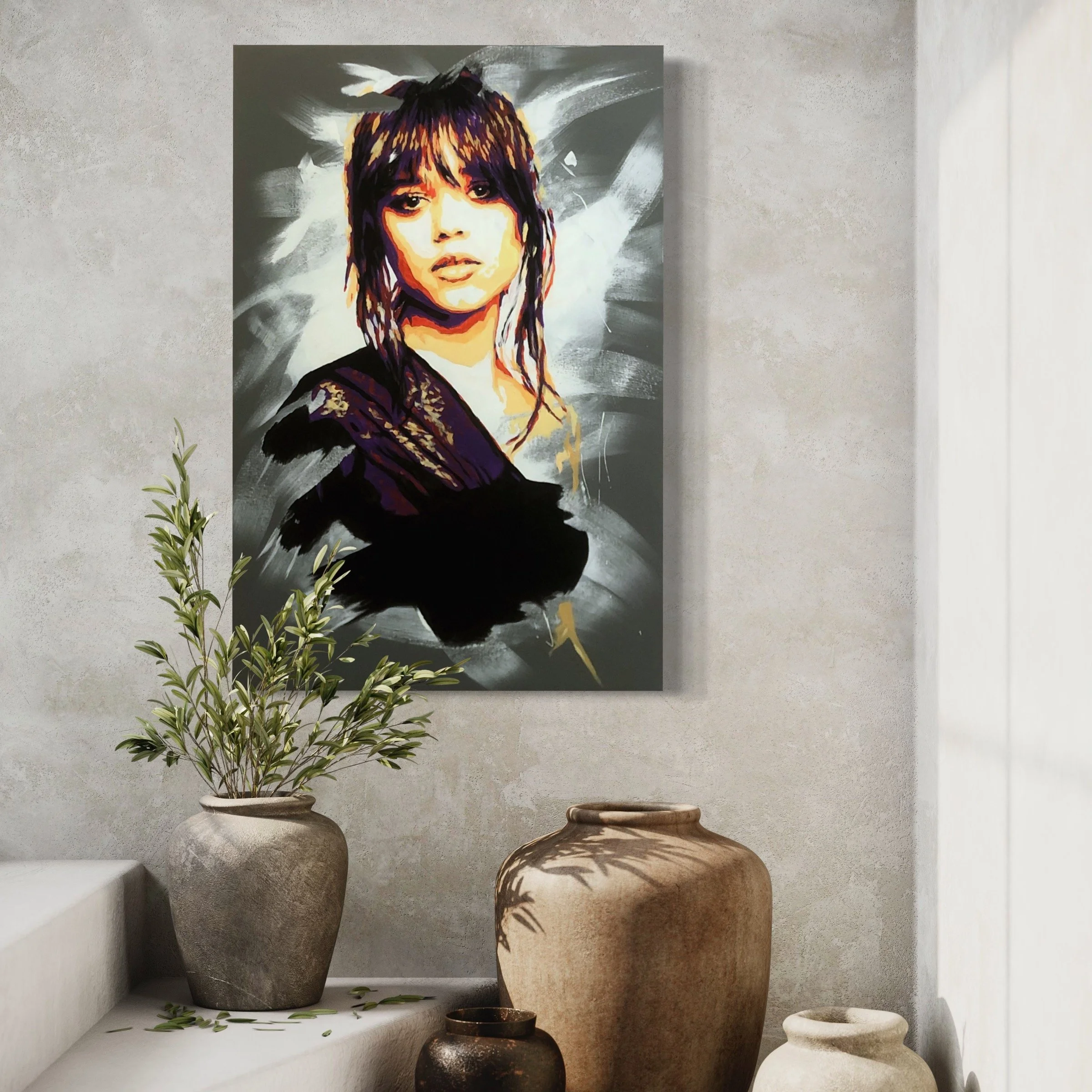 Dans cette œuvre, j’ai voulu capturer l’intensité magnétique de Jenna Ortega, une présence à la fois fragile et puissante, comme suspendue dans un entre-deux où la lumière et l’ombre dansent ensemble. Son regard profond, presque hypnotique, semble traverser la toile pour s’adresser directement au spectateur, portant une histoire non dite, un mystère qui ne demande qu’à être dévoilé.
