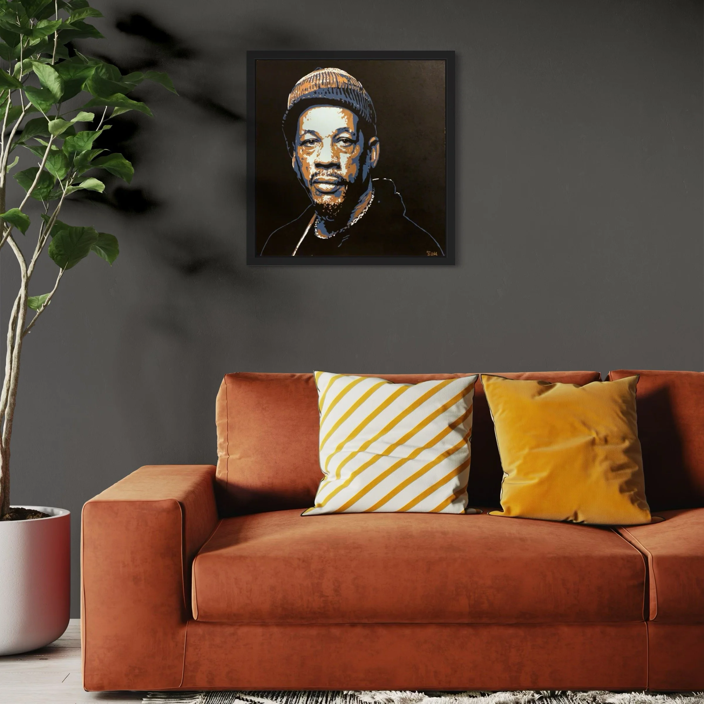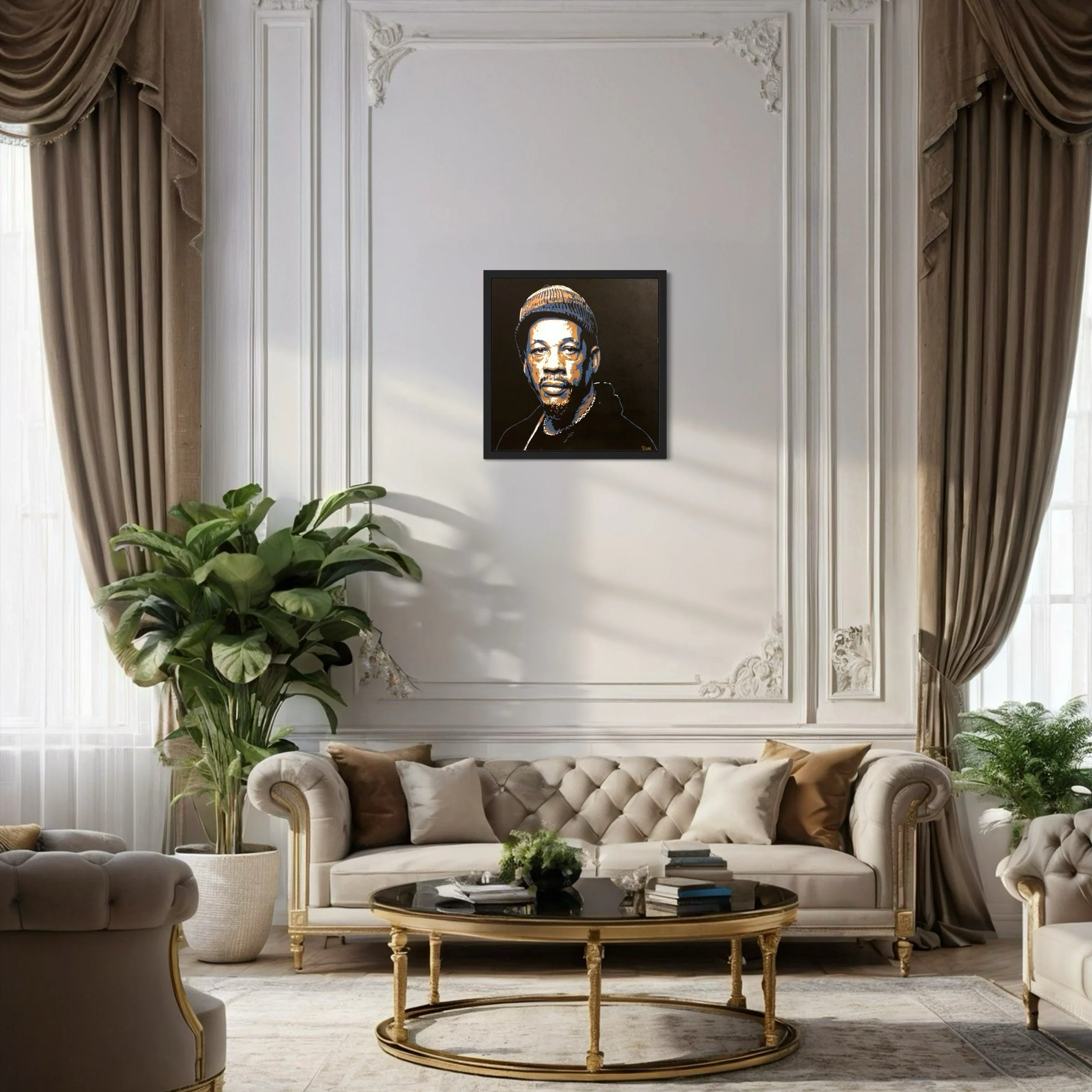 Son regard perçant, presque impénétrable, est à l’image de son parcours : marqué, authentique, sans concessions. À travers des contrastes de noir, de brun et d’or, j’ai cherché à retranscrire cette dualité fascinante entre la rage et la sagesse, la fougue et la réflexion. Il y a dans cette œuvre une forme de tension maîtrisée, une énergie contenue, prête à exploser à tout moment.