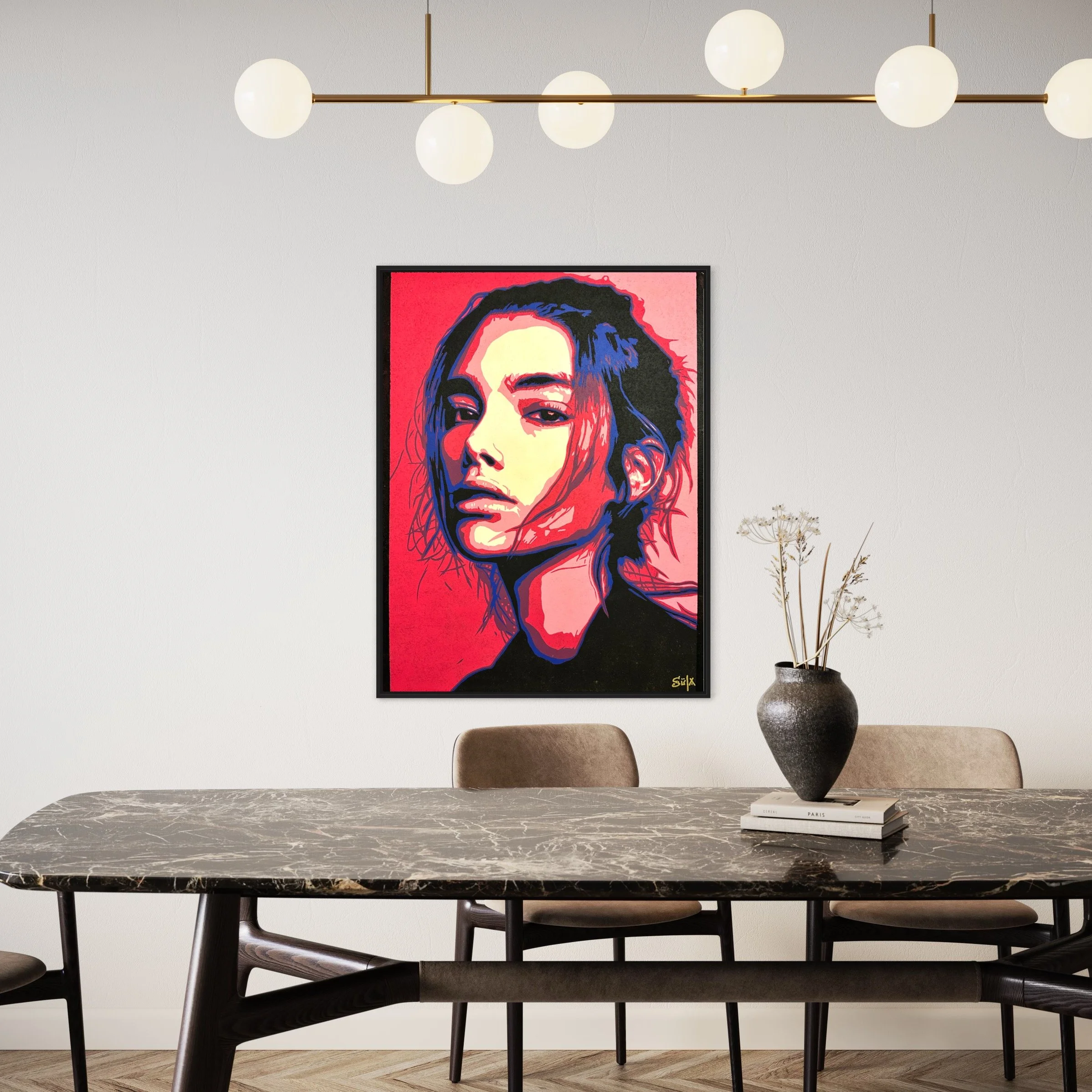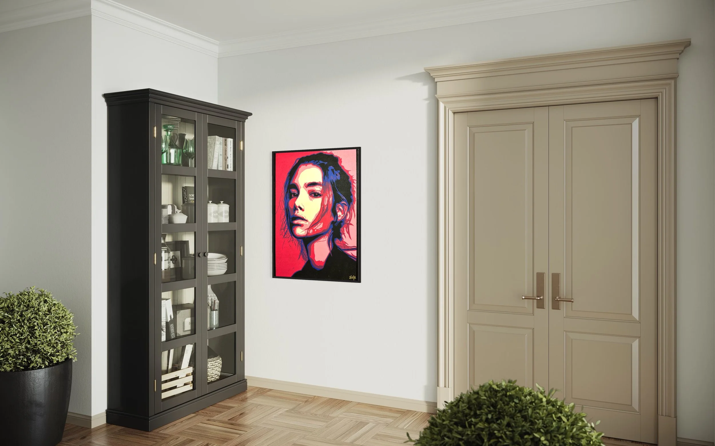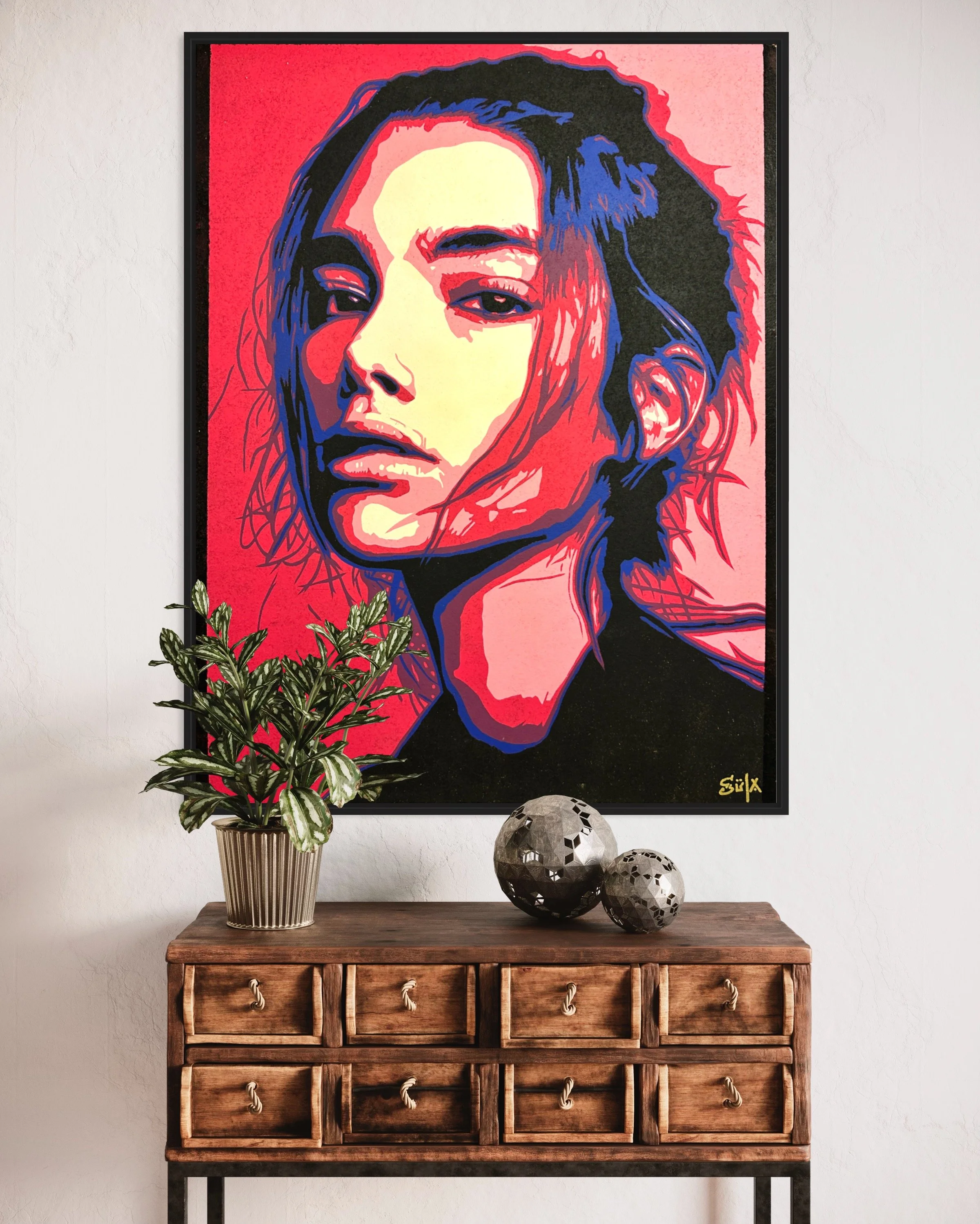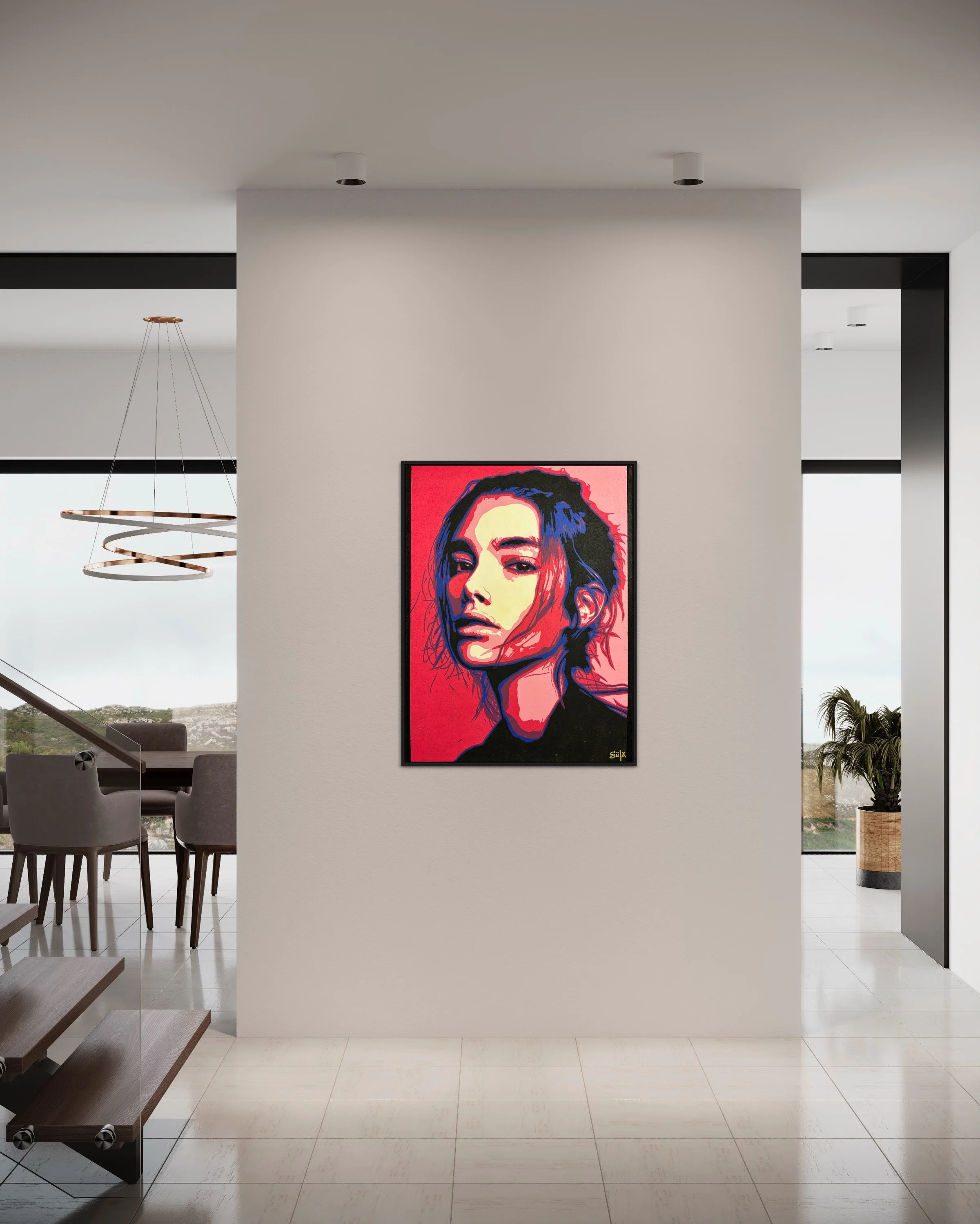 Dans cette œuvre, je voulais capturer l’intensité d’un regard, ce moment suspendu où l’émotion rencontre la lumière. Le visage, baigné dans des teintes de rouge, de bleu et de rose, incarne à la fois force et vulnérabilité. Ces couleurs audacieuses traduisent une dualité profonde : la chaleur d’une passion intérieure et la froideur des ombres où les pensées se perdent.