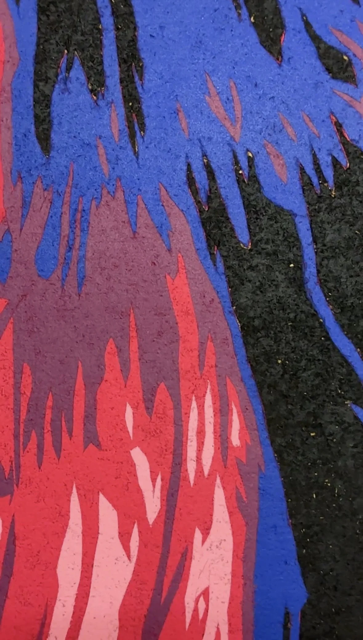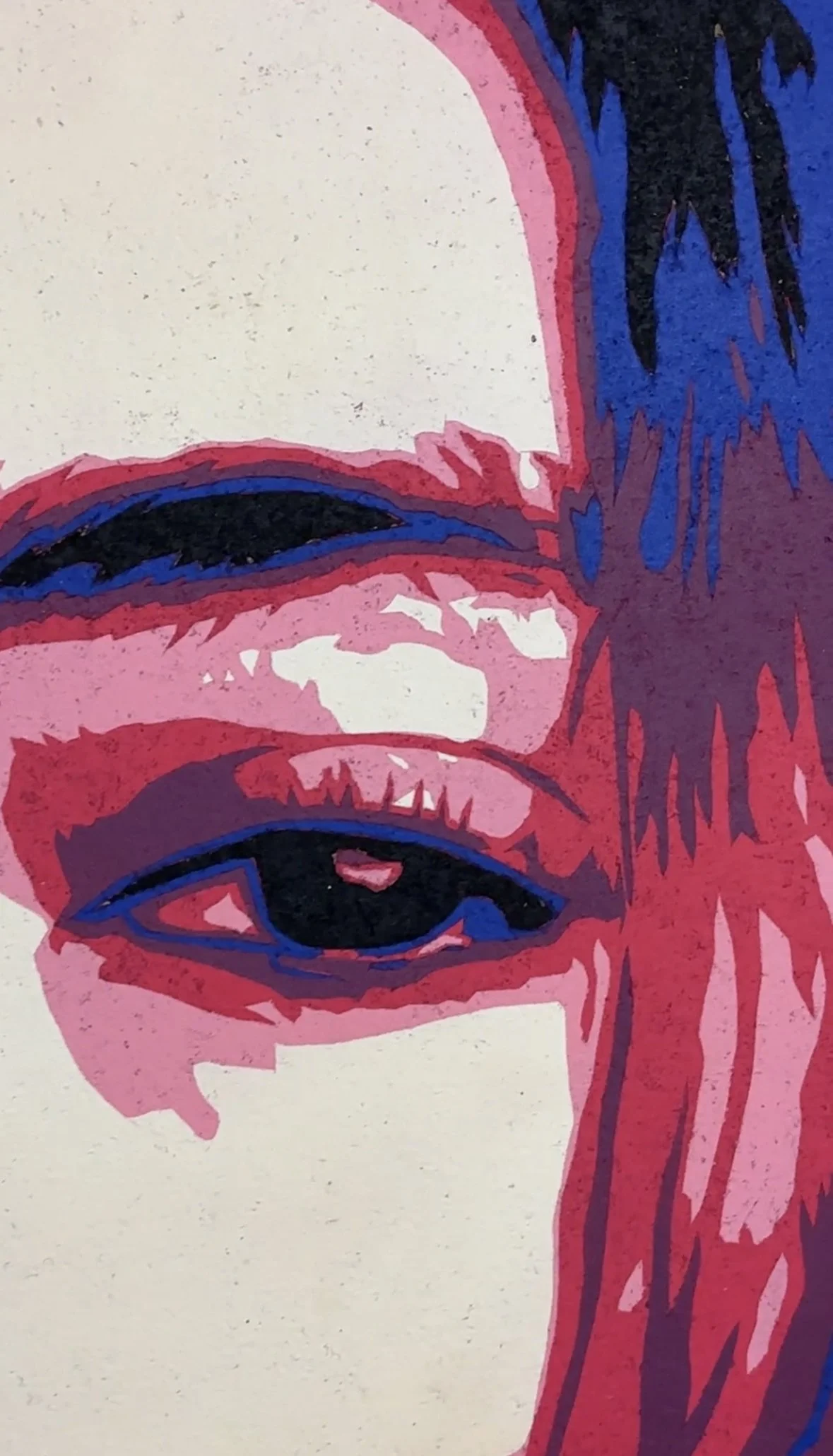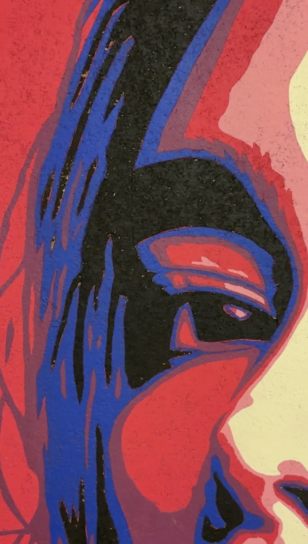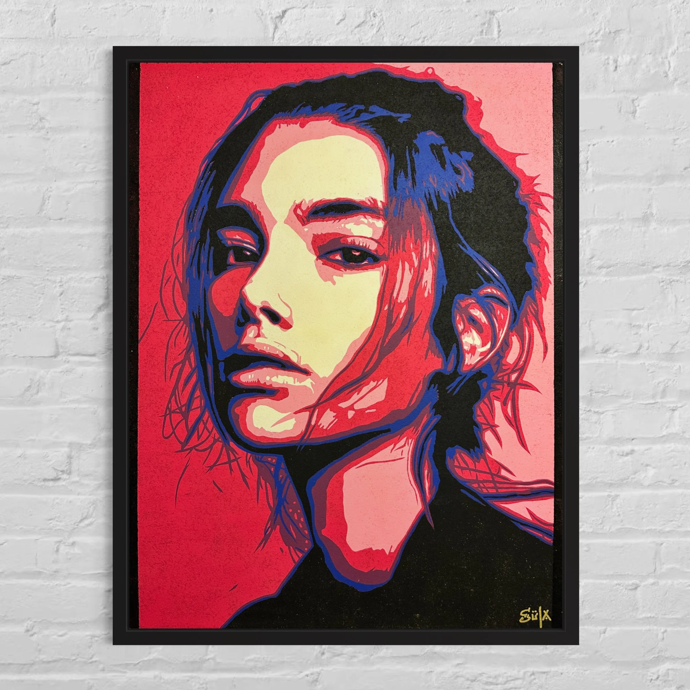 Dans cette œuvre, je voulais capturer l’intensité d’un regard, ce moment suspendu où l’émotion rencontre la lumière. Le visage, baigné dans des teintes de rouge, de bleu et de rose, incarne à la fois force et vulnérabilité. Ces couleurs audacieuses traduisent une dualité profonde : la chaleur d’une passion intérieure et la froideur des ombres où les pensées se perdent.