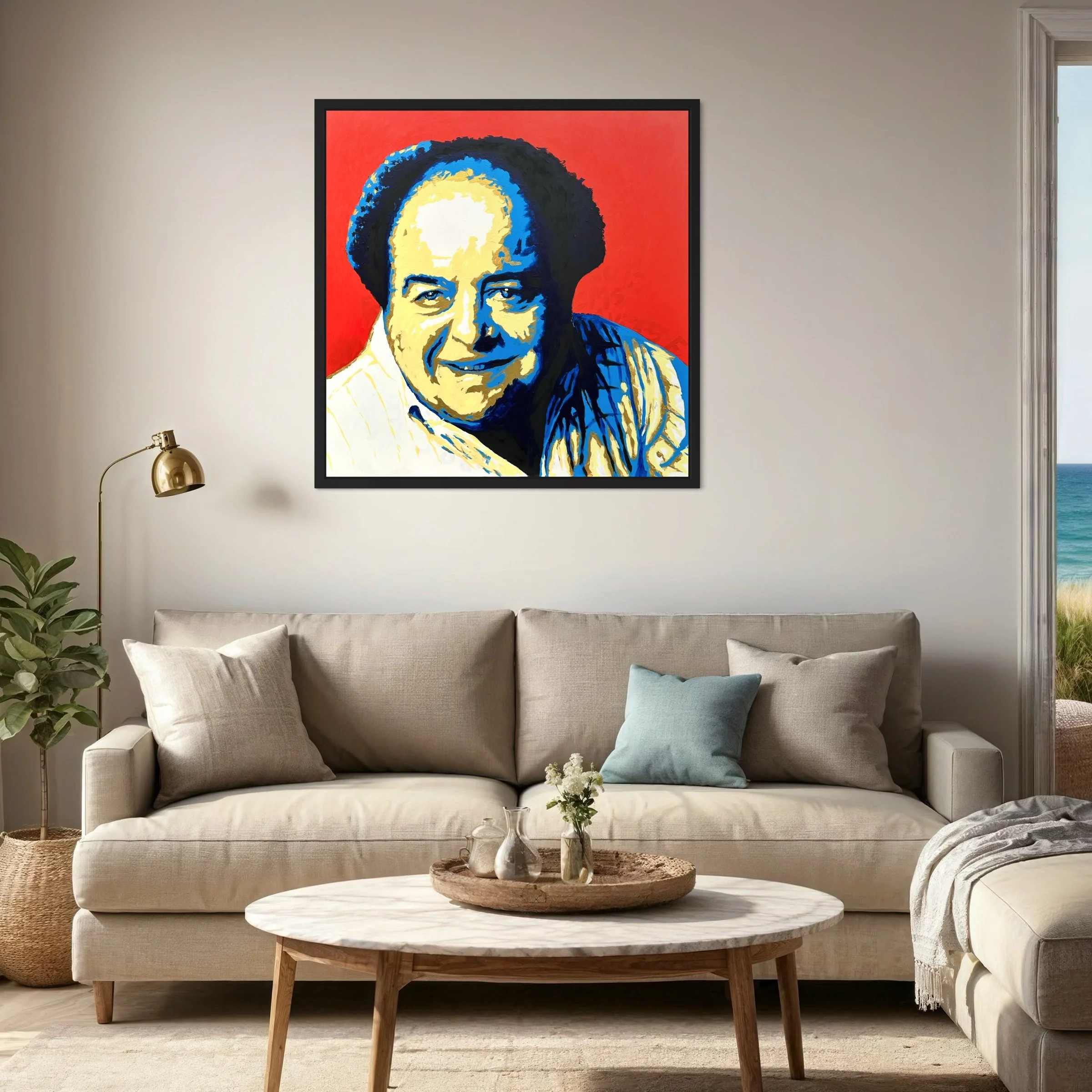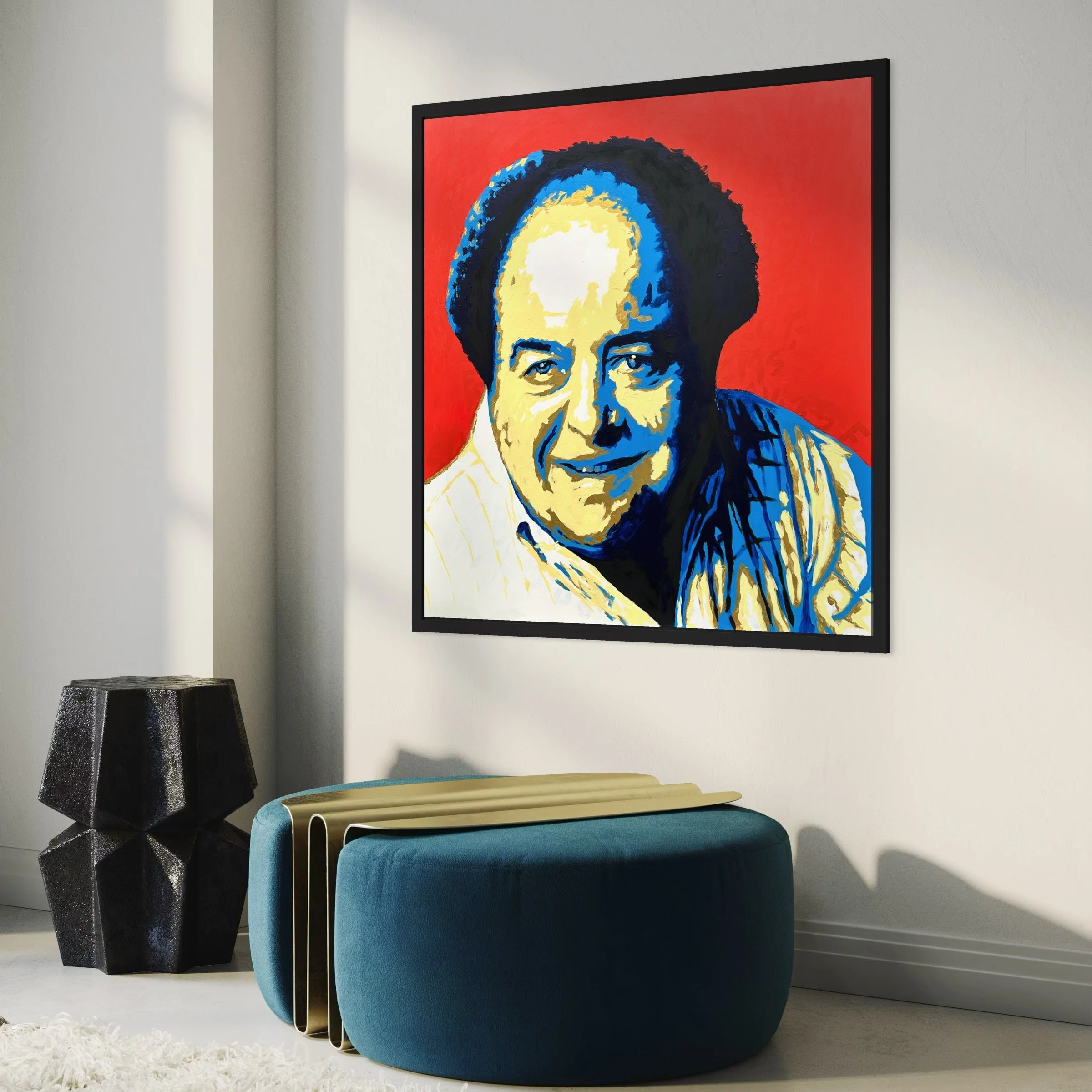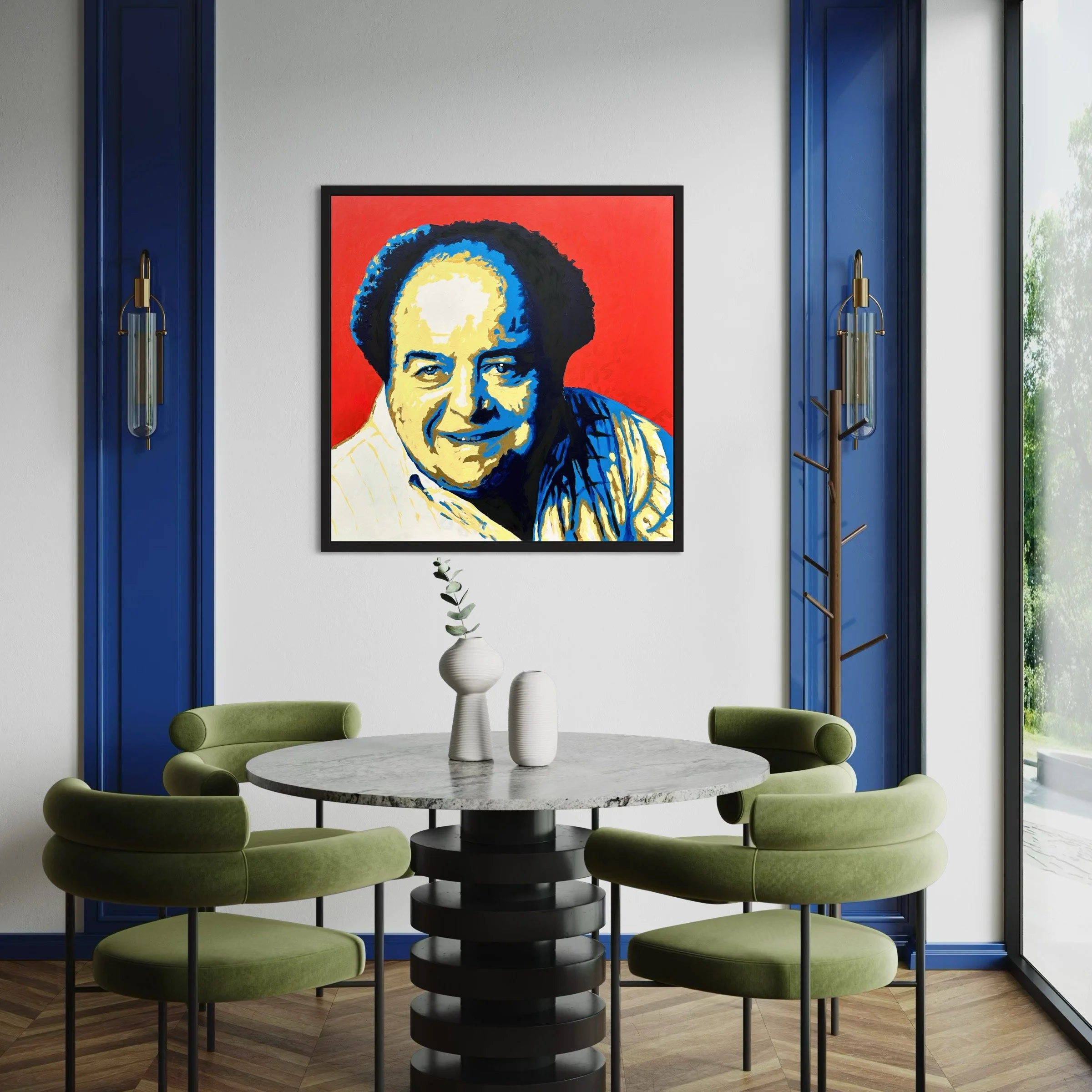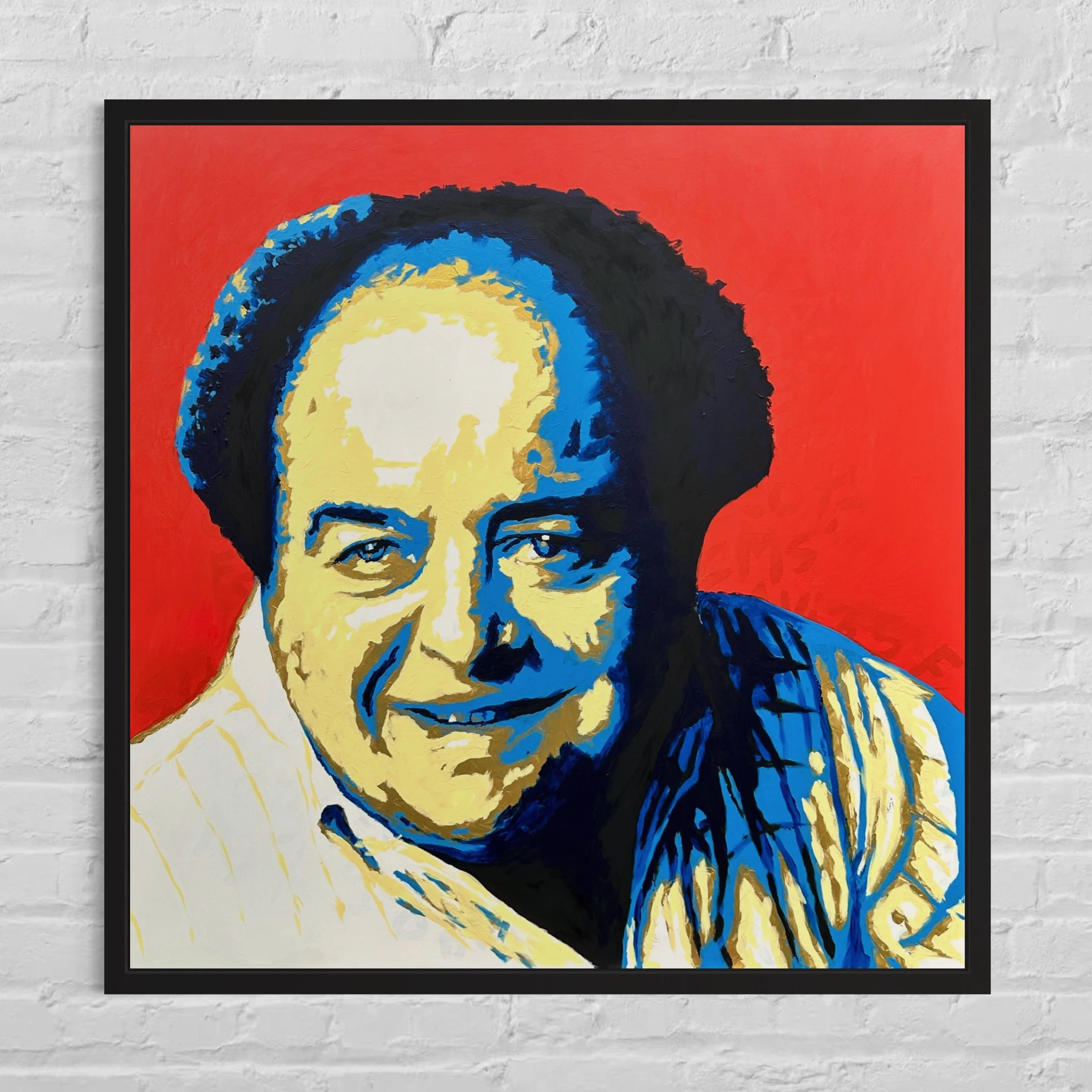 Son regard respire la bienveillance, une chaleur presque intime qui touche le spectateur. À travers des contrastes vifs de bleu et de jaune sur fond rouge éclatant, j’ai cherché à traduire cette dualité qui le caractérisait : une personnalité à la fois profonde et spontanée, capable de faire rire aux éclats tout en suscitant une immense émotion.