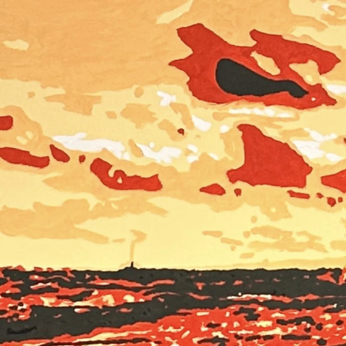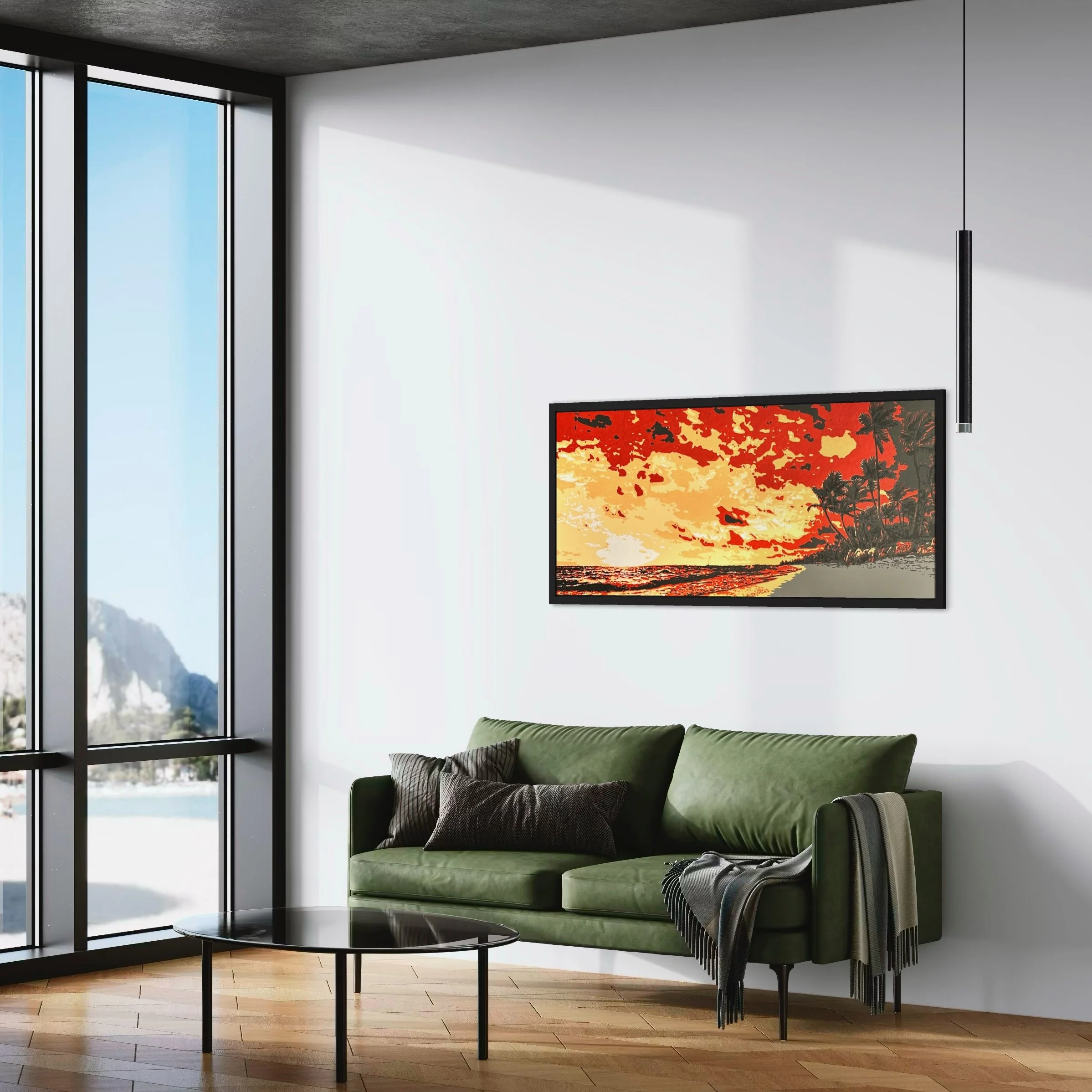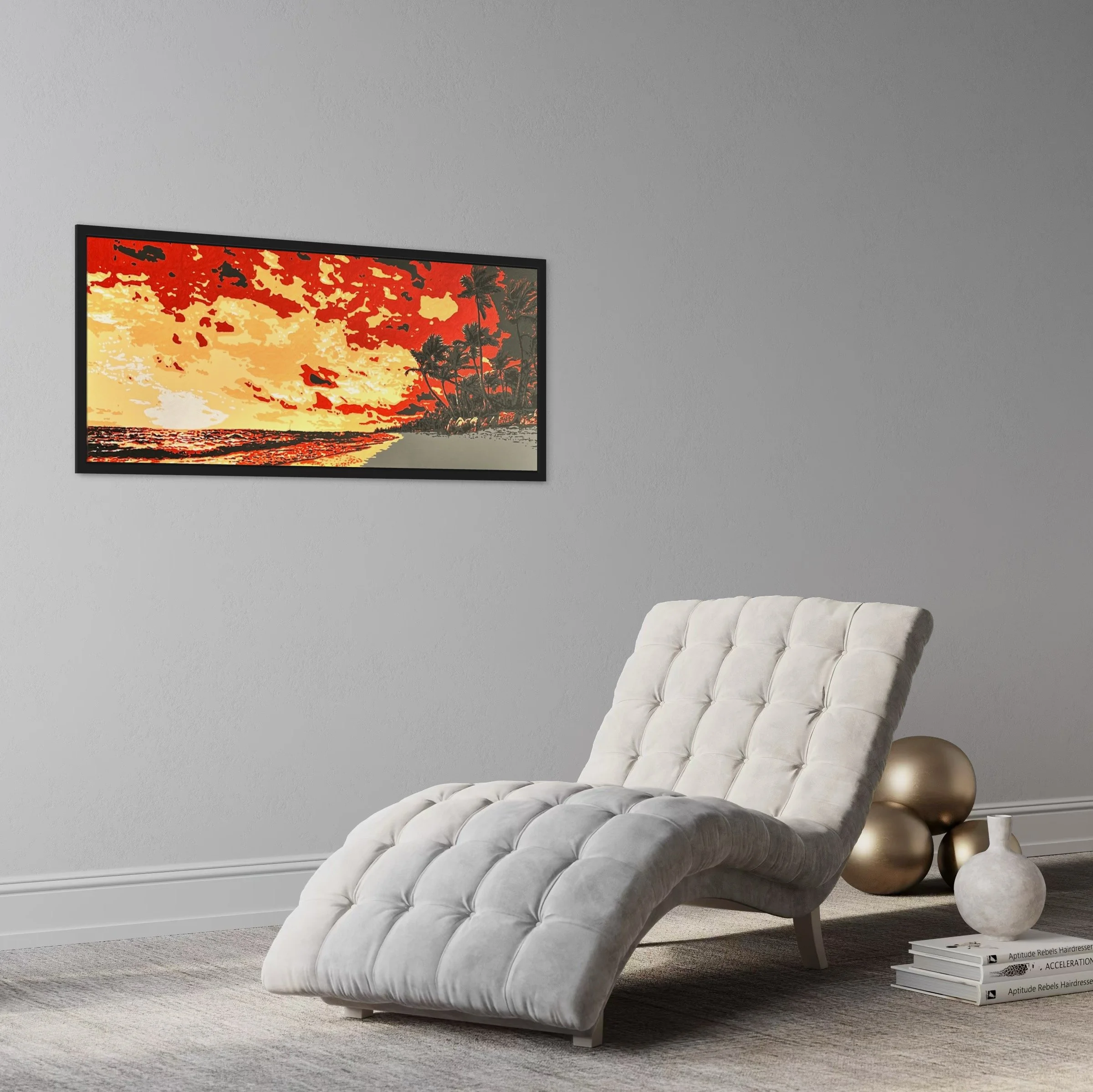 À travers cette composition, j’ai voulu capturer l’essence même de cette plage mythique : l’immensité du ciel embrasé par les derniers rayons du soleil, la mer scintillante qui danse sous la lumière dorée, la silhouette des palmiers bercés par la brise… Tout ici invite à la contemplation, à la sérénité et au voyage intérieur.